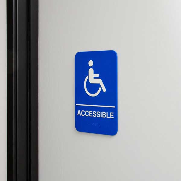 Made of durable plastic, this Accessible Sign with Braille has great color contrast. The white-on-blue lettering allows your customers to see and read this sign from across a room or