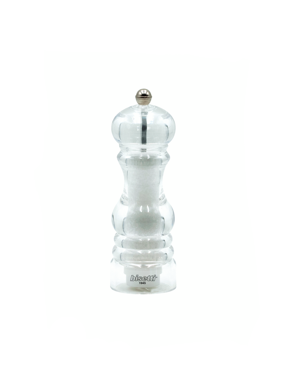 - Bisetti 8420S and 8420 Milan Acrylic Salt and Pepper Mill are two models of mills produced by Bisetti, an Italian company known for its high-quality kitchen tools and accessories. Both models feature a clear acrylic body that allows users to see the salt and pepper level inside the mill. The mills are equipped with a durable grinding mechanism that ensures consistent and precise grinding of salt and pepper. The Bisetti 8420S model has a classic design with a stainless-steel top and a knob for adjusting the grind size, while the 8420 Milan model features a sleek modern design with a clear acrylic top and a metal base. Both models are easy to use and maintain, making them ideal for home kitchens and professional settings alike.