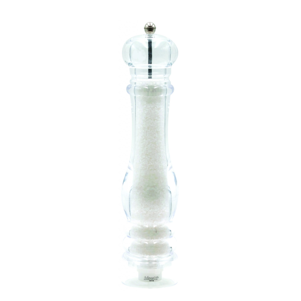 - Bisetti 8430S and 8430 Milan Acrylic Salt and Pepper Mill are two models of mills produced by Bisetti, an Italian company known for its high-quality kitchen tools and accessories. Both models feature a clear acrylic body that allows users to see the salt and pepper level inside the mill. The mills are equipped with a durable grinding mechanism that ensures consistent and precise grinding of salt and pepper. The Bisetti 8430S model has a classic design with a stainless-steel top and a knob for adjusting the grind size, while the 8430 Milan model features a sleek modern design with a clear acrylic top and a metal base. Both models are easy to use and maintain, making them ideal for home kitchens and professional settings alike.