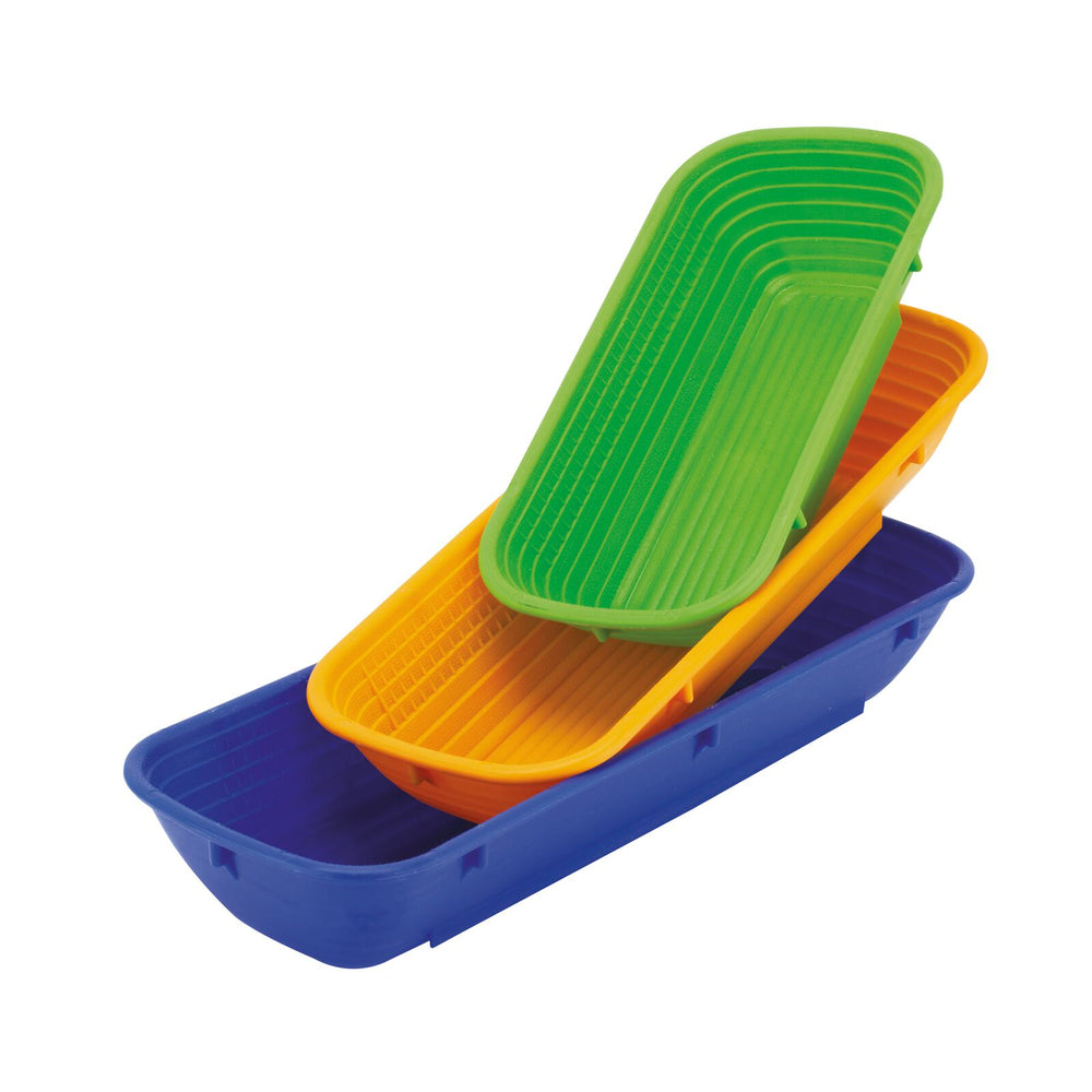 The proving baskets come in three sizes between 500 g and 1500 g, and each size is available in a classic round or oval loaf shape. The smallest sizes come in a fresh green colour, the medium sizes are a cheerful orange, and the largest proving baskets are a brilliant blue, which makes them easy to identify from the colour alone.
