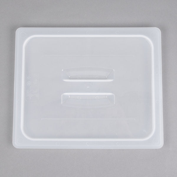 With this 1/2 size translucent polypropylene handled lid, you can rest assured that it will withstand the abuse of daily use, thanks to an easy-to-clean construction. It is designed to withstand temperatures from -40 to 160 degrees Fahrenheit, giving you and your staff flexibility in storage, transport, and use.