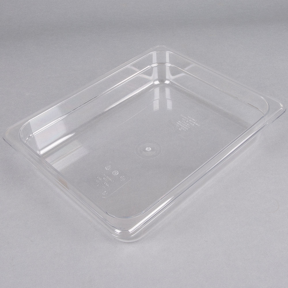 - Ensure efficiency while increasing food safety in your establishment with this Cambro 22CW135 Camwear 2 1/2" deep clear 1/2 size polycarbonate food pan! Built to withstand temperatures from -40 to 210 degrees Fahrenheit, and made of virtually-unbreakable Camwear polycarbonate, this food pan is designed to last even in the toughest commercial kitchens. This pan won't crack, bend, or dent. Use it to store, transport, and serve all from the same pan - the clear complexion offers an easy-to-see option, while molded-in graduations in standard and metric measurements promote easy inventory management.