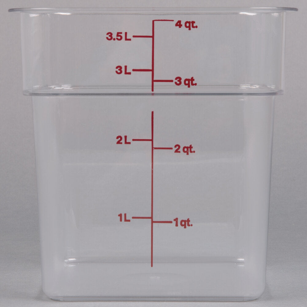 - Create the ideal storage conditions for your cannabis with this Cambro 4SFSCW135 4 qt. clear square polycarbonate cannabis storage container! It is made of crystal clear, virtually unbreakable, FDA approved, polycarbonate that won't be harmed by food acids, oils, or alcohol. Additionally, it is resistant to stains and the potent odors of your product. Exceptional clarity ensures quick identification of its contents, while the 4 qt. capacity is perfect for storing flower and shake. With the square design, pouring is steady and controlled when product is poured at the corners of the container. The flat sides also save space on shelving, with the ability to fit containers closer together than round alternatives. Plus, the food-grade polycarbonate construction can withstand temperatures from -40 to 210 degrees Fahrenheit.
