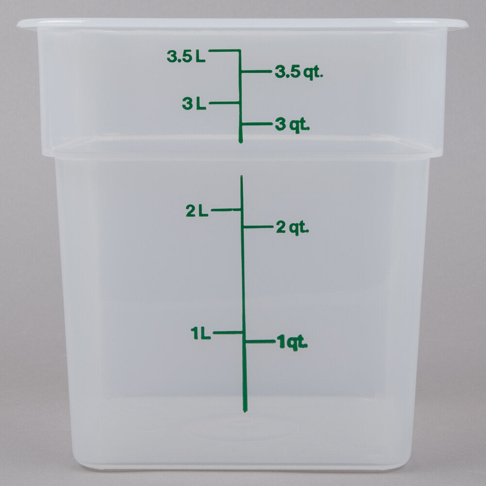 - Create the ideal storage conditions for your cannabis with this Cambro 4SFSPP190 4 qt. translucent square cannabis storage container! It is made with translucent, BPA-free, FDA approved, polypropylene plastic. Its translucent color lets you quickly recognize contents and minimize unnecessary openings, while the 4 qt. capacity is perfect for storing flower and shake. With the square design, pouring is steady and controlled when product is poured at the corners of the container. The flat sides also save space on shelving, with the ability to fit containers closer together than round alternatives. Plus, the food-grade polypropylene construction can withstand temperatures from -40 to 160 degrees Fahrenheit.