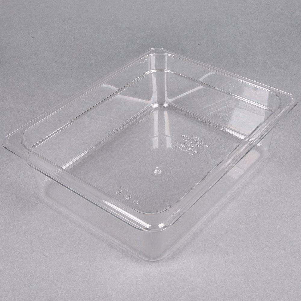 - Ensure efficiency while increasing food safety in your establishment with this Cambro 24CW135 Camwear 4" deep clear 1/2 size polycarbonate food pan! Built to withstand temperatures from -40 to 210 degrees Fahrenheit, and made of virtually-unbreakable Camwear polycarbonate, this food pan is designed to last even in the toughest commercial kitchens. This pan won't crack, bend, or dent. Use it to store, transport, and serve all from the same pan - the clear complexion offers an easy-to-see option, while molded-in graduations in standard and metric measurements promote easy inventory management.
