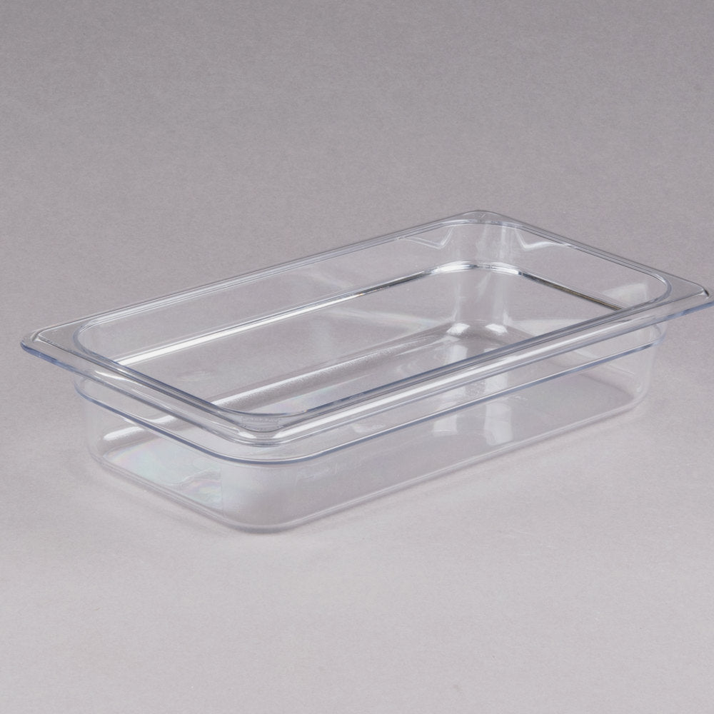 - Ensure efficiency while increasing food safety in your establishment with this Cambro 32CW135 Camwear 2 1/2" deep clear 1/3 size polycarbonate food pan! Built to withstand temperatures from -40 to 210 degrees Fahrenheit, and made of virtually-unbreakable Camwear polycarbonate, this food pan is designed to last even in the toughest commercial kitchens. This pan won't crack, bend, or dent. Use it to store, transport, and serve all from the same pan - the clear complexion offers an easy-to-see option, while molded-in graduations in standard and metric measurements promote easy inventory management.