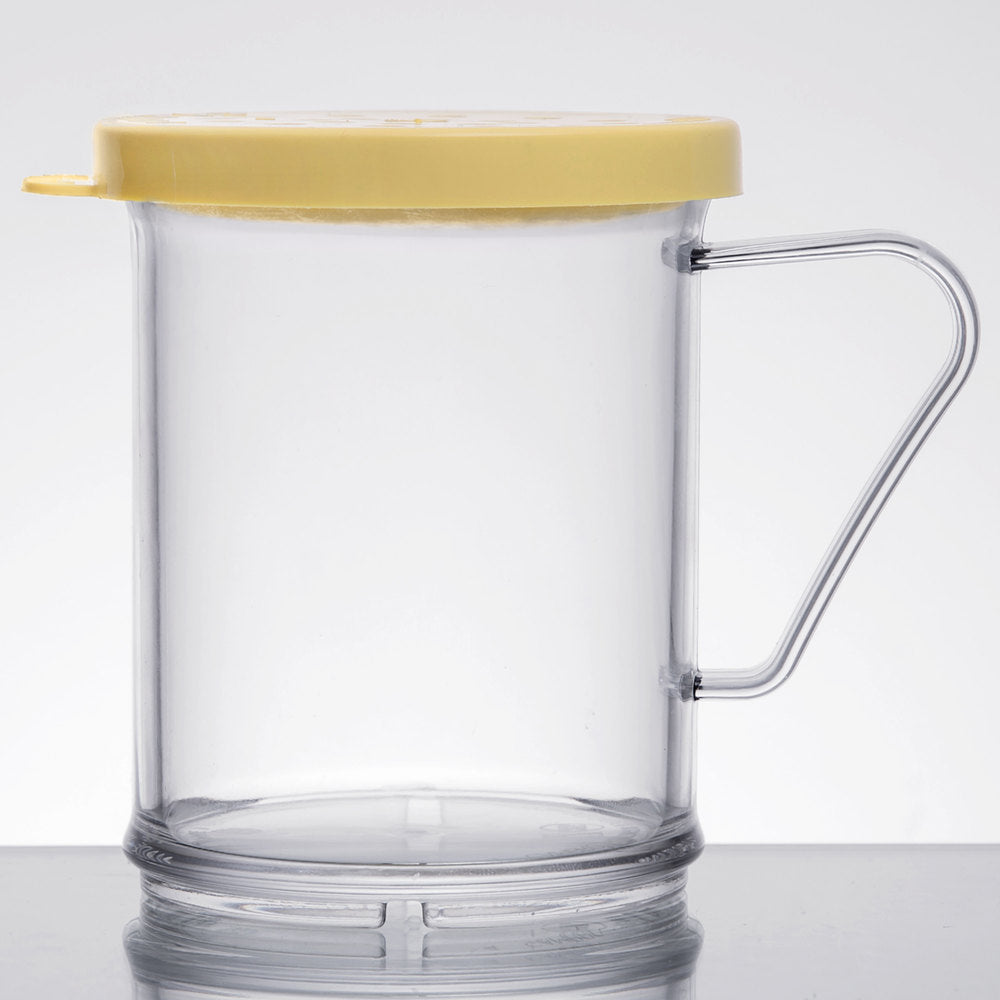 This cheese shaker holds approximately 10 oz. of product. It's made of virtually-unbreakable polycarbonate for longevity in self-service stations at your restaurant, pizzeria, deli, or bistro. Use it in the kitchen for back-of-house purposes, or on the dining table for guests to season at their convenience! The versatile design makes it a staple in nearly any area. Plus, the handled design makes it easy to grasp for a secure hold by staff and guests alike.