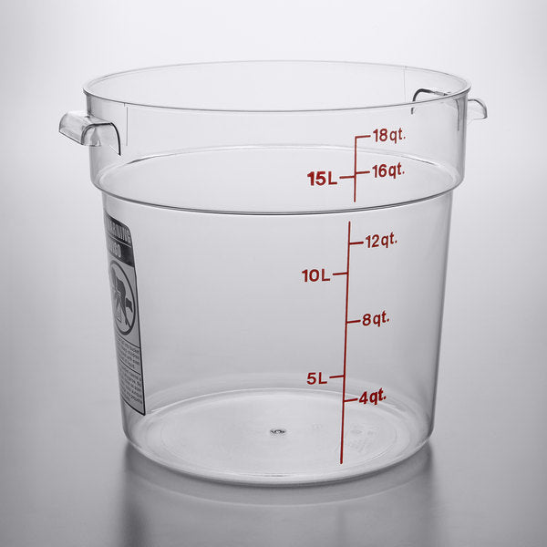 - Exceedingly versatile in both size and design, this food storage container is perfect for portioning and storing all your ingredients, toppings, and pre-prepared foods. Exceptional clarity allows you to quickly recognize and assess contents, while the ample 18 qt. capacity provides users with endless storage possibilities! Equipping the container with a compatible lid (sold separately) eliminates the need for plastic wrap and keeps contents covered for superior freshness, spill resistance, and cross-contamination prevention.