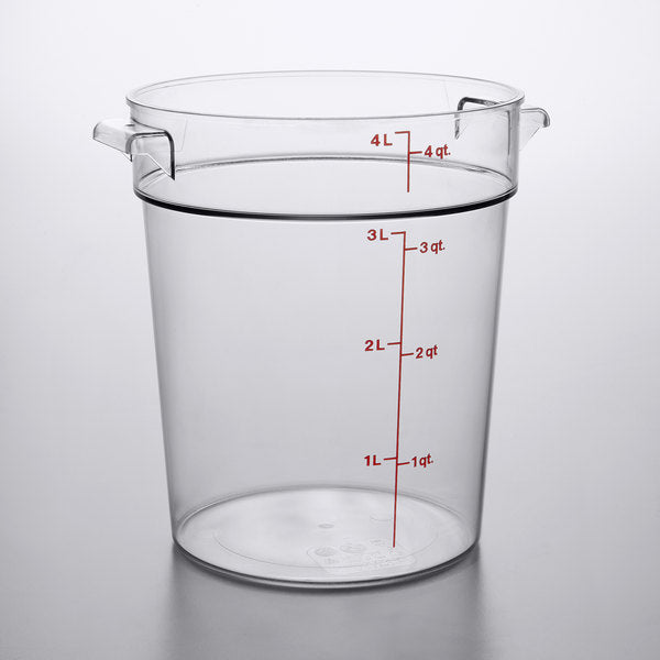 - Exceedingly versatile in both size and design, this food storage container is perfect for portioning and storing all your ingredients, toppings, and pre-prepared foods. Exceptional clarity allows you to quickly recognize and assess contents, while the ample 4 qt. capacity provides users with endless storage possibilities! Equipping the container with a compatible lid (sold separately) eliminates the need for plastic wrap and keeps contents covered for superior freshness, spill resistance, and cross-contamination prevention.