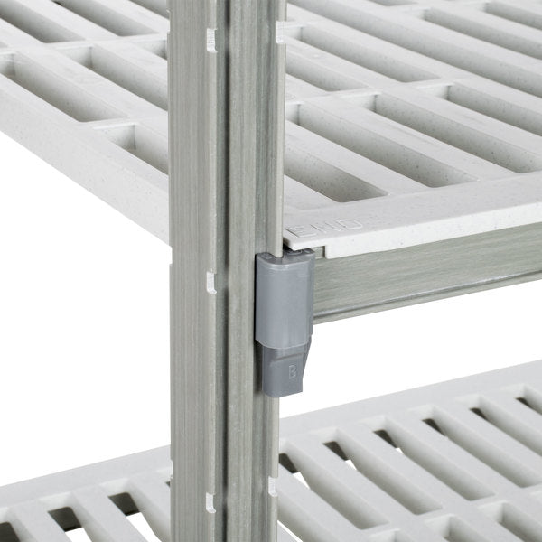 Versatility is built in to this shelving unit! The shelves can easily be adjusted in 4" increments even after the shelving unit is assembled. Plus, you can be sure of a safe and sanitary storage area since it has Camguard antimicrobial technology built in to suppress the growth of microbes between cleanings. The vented shelf plates are impervious to chemicals and moisture, making this unit easy to clean. Just take a cloth and wipe them down as you would other surfaces in your kitchen or storage room. When a more thorough cleaning is called for, you can remove the shelf plates and run them through the dishwasher! In addition, the vented shelf design promotes greater air circulation and product visibility which will come in handy in refrigerated storage applications.