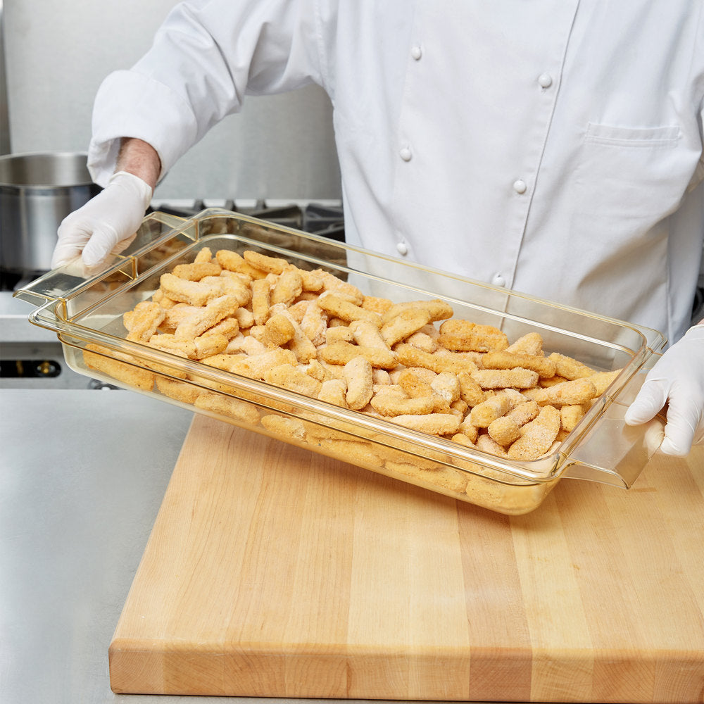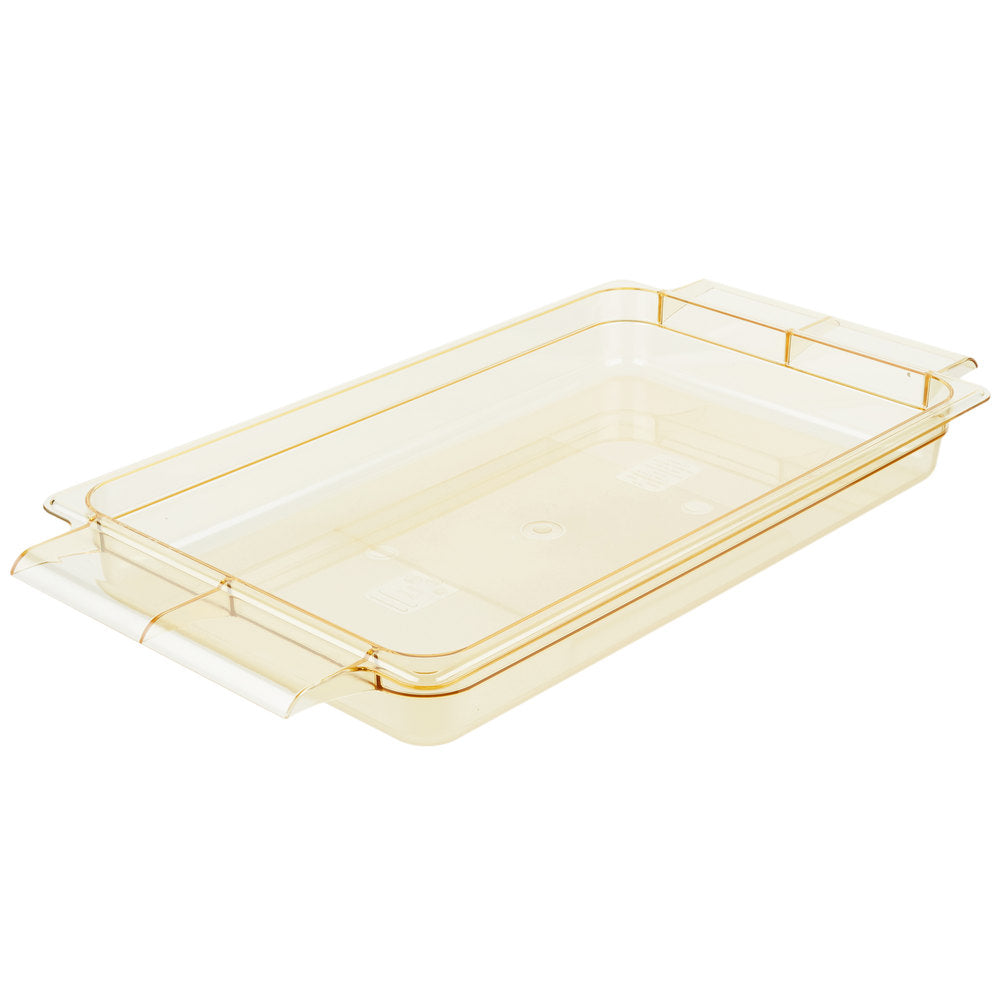 This amber Cambro 12HPH150 H-Pan™ 2 1/2" deep, full size high heat plastic food pan is perfect for holding high heat and freezing foods in any commercial kitchen. For employee safety, it features two convenient handles which able the user to reach the pan from either side of your hot holding bin. It's built with strong, durable materials to withstand extreme temperatures from -40 to 375 degrees Fahrenheit and will help maintain your food's temperature after it's taken out of the oven or freezer. This high heat food pan's convenient, non-stick smooth interior surface increases yields and promotes easy cleaning. To aid in storage, transport, and create more usable space, this pan will even stack with similar items without wedging or sticking.