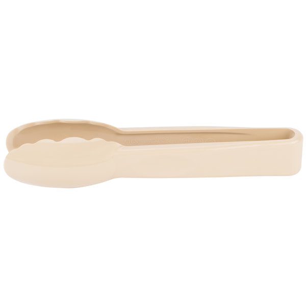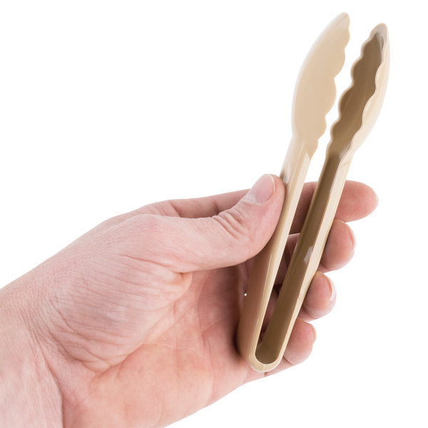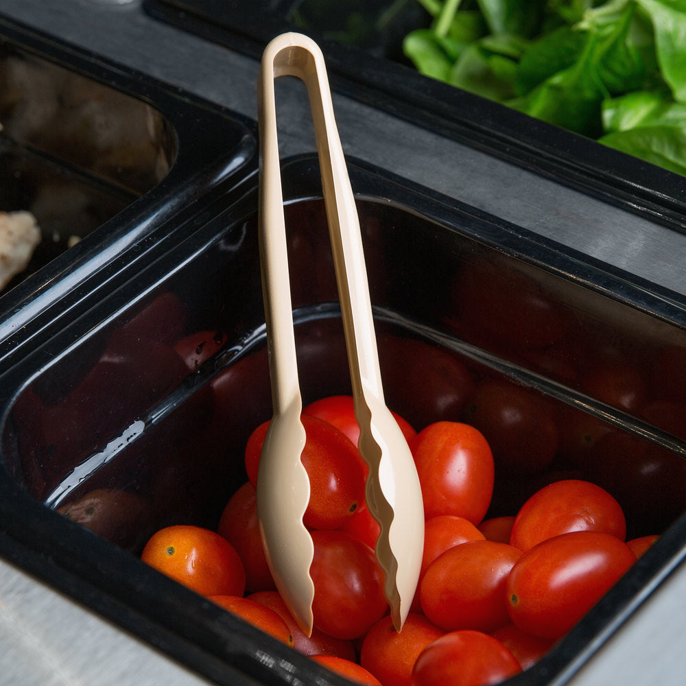- Easily grasp and serve salad, hors d'oeuvres, baked goods, and more using these Cambro Lugano 6TGS133 6" beige scallop grip plastic tongs. Perfect for both hot and cold foods, these tongs are made from a high-heat material that is safe up to 300 degrees Fahrenheit, making them ideal to use while serving food on steam tables and buffet lines. Ergonomically designed to increase and maintain your establishment's productivity, these Cambro tongs feature scalloped grips which act as teeth to provide a secure and comfortable hold, even with foods like pasta that can easily slip. These easy-to-use tongs allow both your servers and your guests to effortlessly grasp and place food onto plates, so everyone is happy.