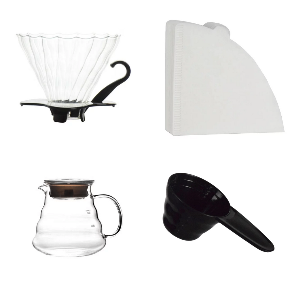 V60 Glass Coffee Server 600ml: The glass coffee server is specifically designed to fit the V60 dripper and collect the brewed coffee. With a capacity of 600ml, it allows you to brew multiple cups of coffee or serve coffee to a small group.