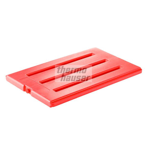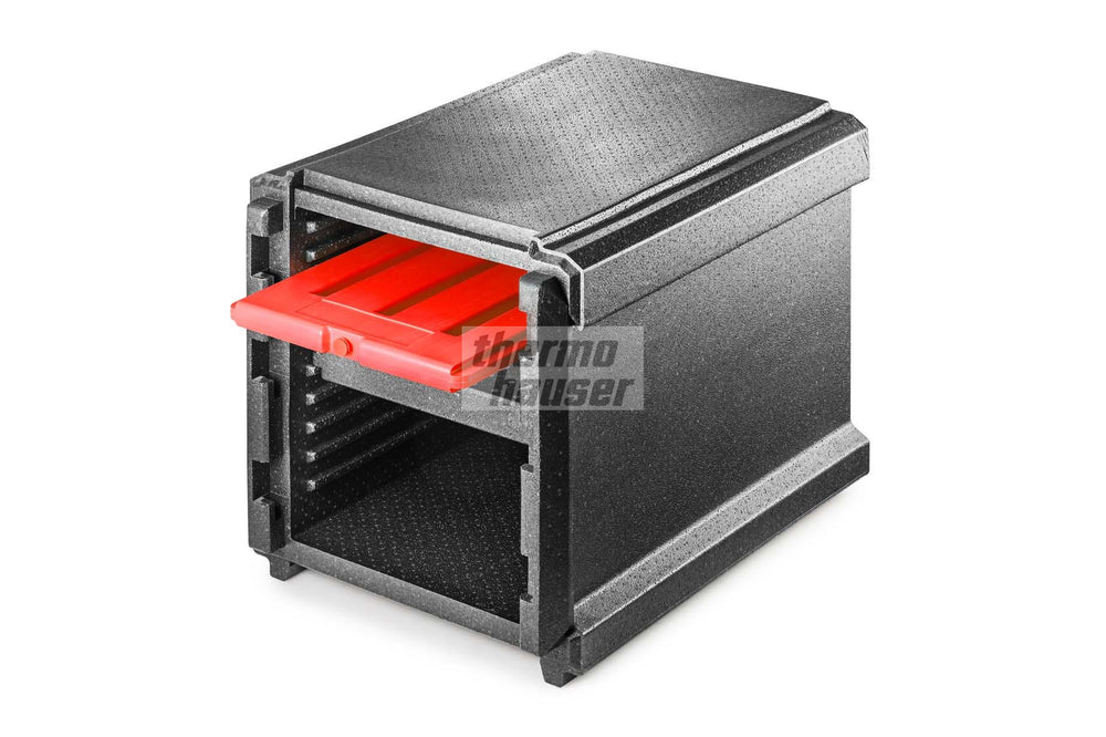 The warming plate – which is clearly visible in the red colour – can be heated in the lying (horizontal) position in a water bath or a steam oven at a maximum of +85 degrees Celsius and no longer than 30 to 40 minutes. Directly after this process, the warming plate can be placed in the box together with the warm dishes. Please pay attention to the fact that the warming plates are not suitable for the use in microwaves.
