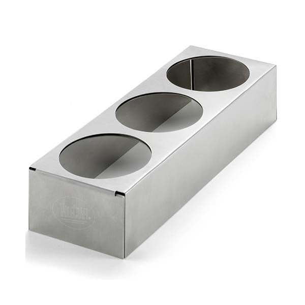 Keep up to (6) 12 oz., 16 oz., or 24 oz. capacity squeeze bottles in a neat and tidy fashion with this expandable countertop squeeze bottle holder. This holder easily expands to meet your unique needs, with up to 6 (3″ diameter) holes machine cut into it. Two parts, each with 3 hole cutouts make up this unit, with a tab/slot design that makes expansion and contraction fast and efficient – the tab simply slides into the slots to lock the two parts together.