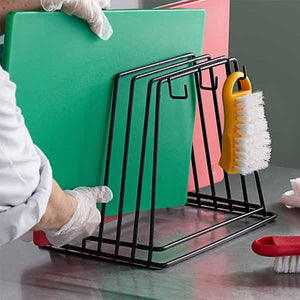 A valuable addition to any kitchen, this 6-board black cutting board rack is an excellent way to store your cutting boards. By placing this rack on your countertop or table, your cutting boards are always within reach and easy to retrieve. This rack comes with slots to hold six cutting boards and six brush hanger hooks. You can also use this rack as a drying rack after washing your cutting boards or pizza racks to enable them to drip dry and save time and space.