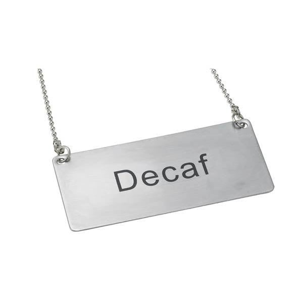 Having a silver finish, this signage highlights “Decaf”, while its 12″ long chain is ideal for all sizes of dispensers and urns. Constructed from exceptionally durable stainless steel, this chain