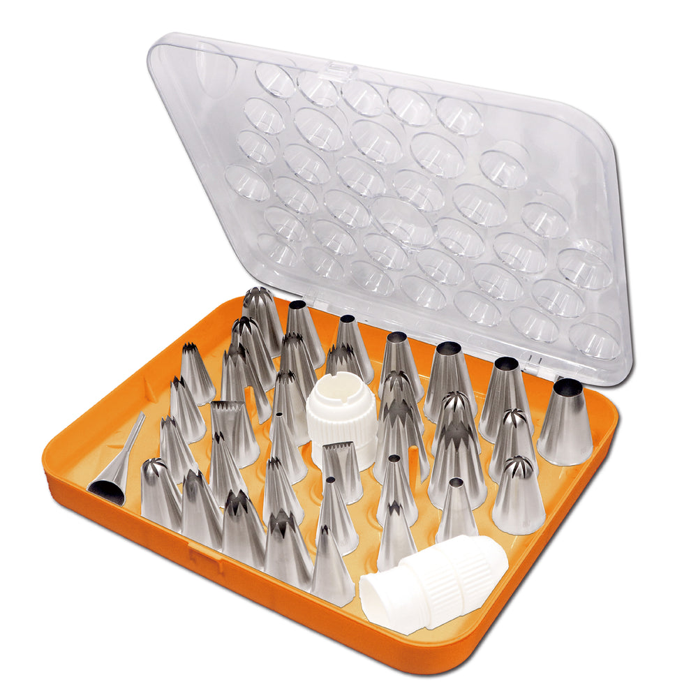 Featuring a plethora of helpful decorating tools, this set allows for a variety of designs ranging from writing letters to creating shapes and patterns, ensuring you can achieve the unique style and flair you're looking for. To help you easily create beautiful, one-of-a-kind flowers, a flower nail is also included. Incredibly easy to clean, simply wipe down the case with a soft, damp cloth and place the tips, flower nail, and coupler into the top rack of the dishwasher. Great for decorating cakes, cupcakes, and cookies, this set will be sure to give you the edge in pastry decorating!