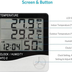 Indoor & Outdoor Temp Humidity Monitor: Large Screen with Huge Digits displays the current indoor-outdoor temperature and humidity percentages.