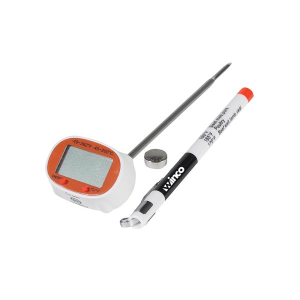 Easily take appropriate temperature readings on your food products with this Digital Pocket Thermometer – 1-3/16″ LCD, 4-3/4″ Probe / Winco. This digital pocket thermometer has a stainless-steel probe and its head swivels 180° for easy reading. As added benefits, it has a meat cooking temperature guide on the handle, and its sleeve will keep it sealed and sanitary when not in use. Use it while cooking in the oven or on the grill at your restaurant, bistro, café, deli, or home.