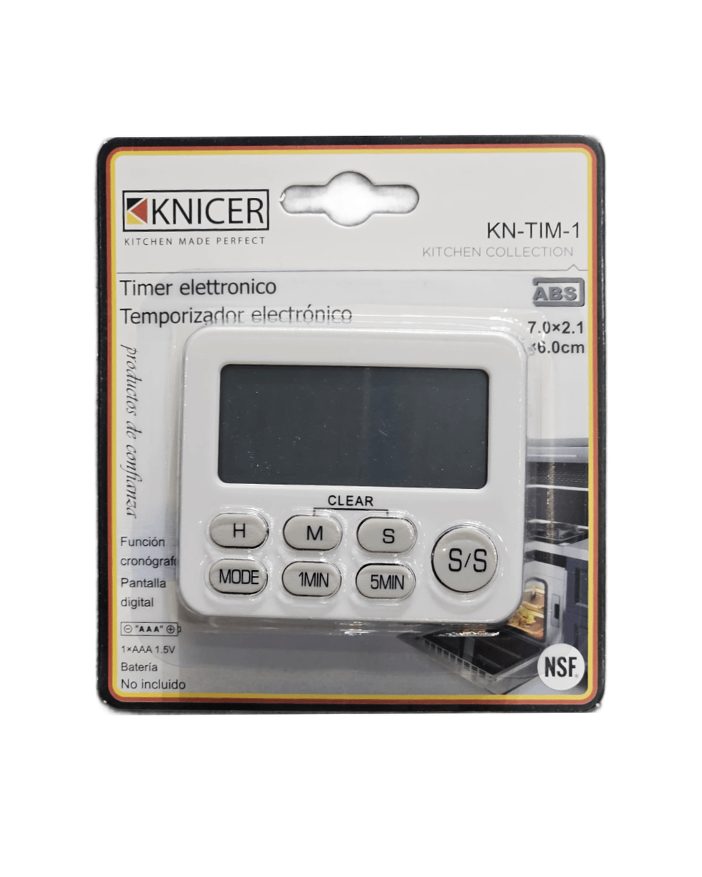 The Knicer digital timer is the ideal tool for those seeking precision and functionality in the kitchen. With a rectangular design and a white finish, it blends perfectly into any setting, providing a modern and minimalist touch. Its compact 7 cm size makes it easy to handle and store, making it an indispensable ally for amateur and professional chefs.