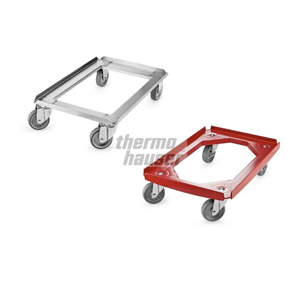 These chassis – available in red plastic material or stainless steel, which is your personal choice – are specially designed for use with the thermohauser insulation boxes of the GN 1/1series. They help reduce the effort required for transport of filled (and therefore heavyweight) boxes. Both dollies have 2 swivel and 2 fixed castors and can carry a load of up to 250 kg.