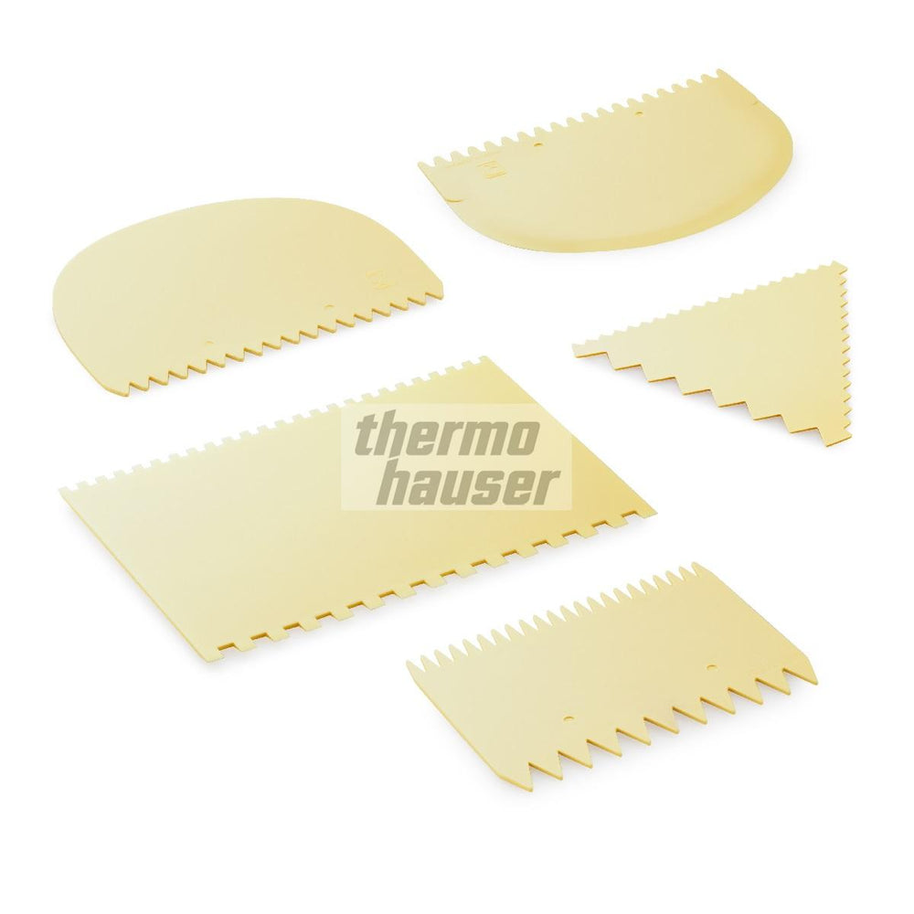 The dough scrapers / comb scrapers are made of food-safe plastic (PP) in plain ivory .