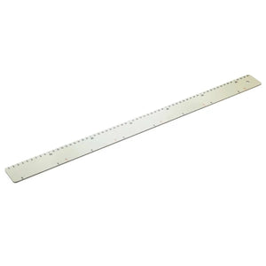 The rulers are 64.0 cm long, 5.0 cm wide, and approximately 0.2 cm thick. Two different plastic qualities are available, depending on your requirements: sturdy Resopal (natural white with a blue scale) or flexible polystyrene (PS, white with a red scale).