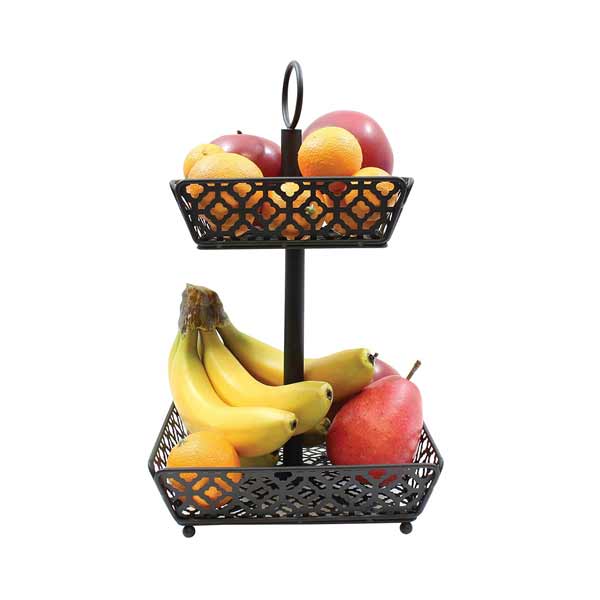 Display fruit in style at your grocery store, produce stand, cafe, coffee shop, or breakfast bar with this two-tier metal display basket. You can also use this basket to display fruits, nuts, and pastries on a buffet table or you can showcase snacks, candy, or sandwiches by a register in your cafeteria or restaurant.