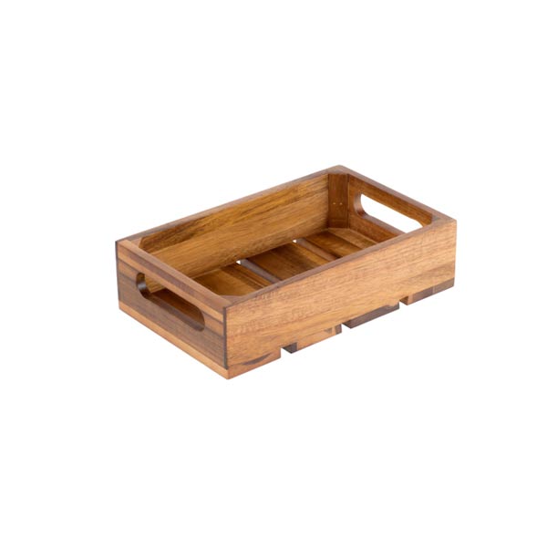 Store dinnerware in it at the front of your buffet, or keep fruit and bread arranged at your hotel’s breakfast nook. The 1/4 size means a standard 1/4 size food pan fits inside of it for easy product placement and removal. This durable wooden crate features a professional acacia coloring designed to blend into any establishment. It can hold a 2 1/2″ deep standard size food pan. Use this crate with other pieces from Tablecraft to create a dynamic presentation of your fresh fruits, vegetables, bread, and appetizers.
