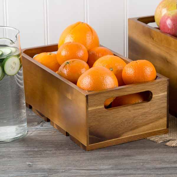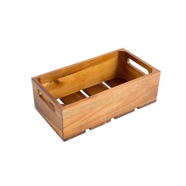 Store dinnerware in it at the front of your buffet, or keep fruit and bread arranged at your hotel’s breakfast nook with this Gastronorm Acacia Wood Serving and Display Crate 13″ x 7″ x 4 1/4″ from tablecraft. The 1/4 size means a standard 1/4 size food pan fits inside of it for easy product placement and removal. This durable wooden crate features a professional acacia coloring designed to blend into any establishment. It can hold a 4 1/2″ deep standard size food pan. Use this crate with other pieces from Tablecraft to create a dynamic presentation of your fresh fruits, vegetables, bread, and appetizers.
