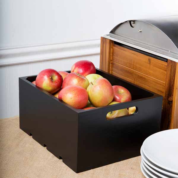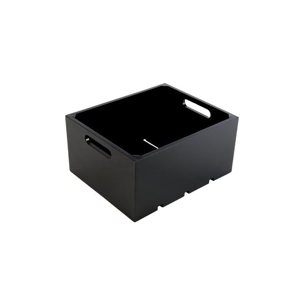 Place this crate to work in a variety of ways, from kitchen storage to front of house applications. You can store dinnerware in it at the front of your buffet, or keep fruit and bread organized at your hotel’s breakfast nook with this Gastronorm Black Wood Serving and Display Crate 13″ x 10 3/8″ x 6 1/4″. This long-lasting wooden crate features a professional black coloring designed to blend into any establishment. It can hold a 6″ deep standard size food pan. . Use this crate with other pieces from Tablecraft to create a dynamic presentation of your fresh fruits, vegetables, bread, and appetizers!