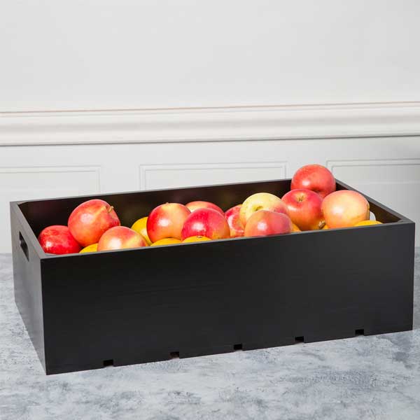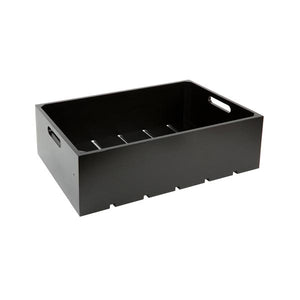 Place this crate to work in a variety of ways, from kitchen storage to front of house applications. You can store dinnerware in it at the front of your buffet, or keep fruit and bread organized at your hotel’s breakfast nook with this Gastronorm Black Wood Serving and Display Crate 21″ x 13″ x 6 1/4″. This long-lasting wooden crate features a professional black coloring designed to blend into any establishment. It can hold a 6″ deep standard size food pan. . Use this crate with other pieces from Tablecraft to create a dynamic presentation of your fresh fruits, vegetables, bread, and appetizers!