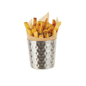 This Hammered Stainless Steel French Fry Cup is excellent for use in a casual or upscale setting. You can even pair this holder with a matching sauce cup to offer condiments like ketchup or a signature sauce alongside your appetizers. Serve fresh cut french fries, onion rings, mozzarella sticks, and a variety of other snacks and side dishes in this cup. Versatile offering option for your trendy restaurant catered event, or bar.
