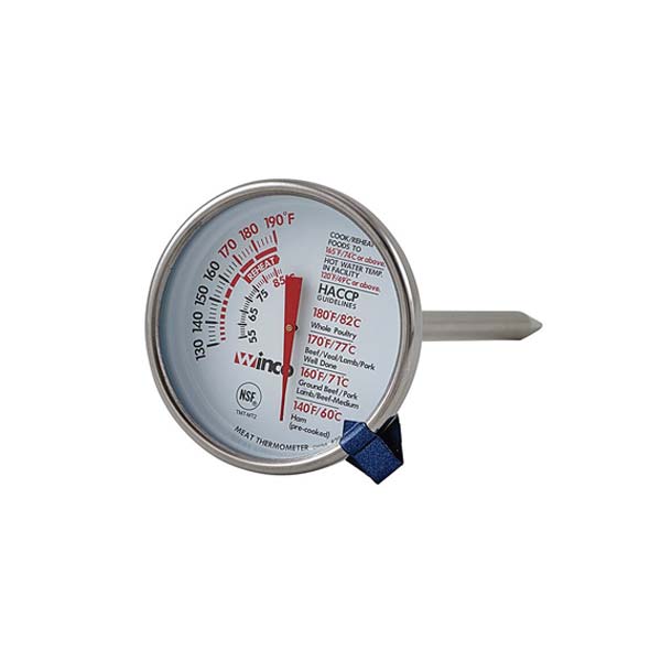 The 5″ Hand Held Meat Thermometer from Winco helps chefs to monitor the internal temperature of meat and poultry during the cooking process. Created to deliver precise readings every time, this meat thermometer has a temperature range of 120 to 200 degrees Fahrenheit. To help chefs determine the correct temperature for different types of meat, this NSF approved thermometer has an easy-to-read dial with indicator markings.