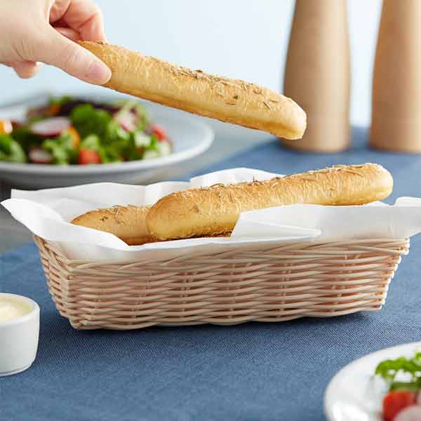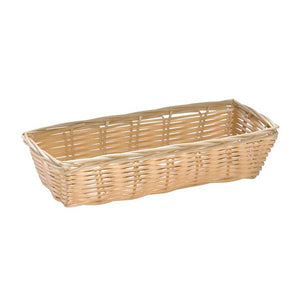 This Handwoven Beige Rectangular Polypropylene Basket is made from smooth Polypropylene, giving a sleek, glossy exterior with an elegantly braided rim and no jagged edges. Its woven, ribbed design strengthens the bottom and sides, providing a durable construction ideal for serving candy, chips, and crackers, as well as small rolls and bread slices. Cleaning this basket is as simple as wiping it down with a damp cloth to guarantee each customer gets the best presentation.