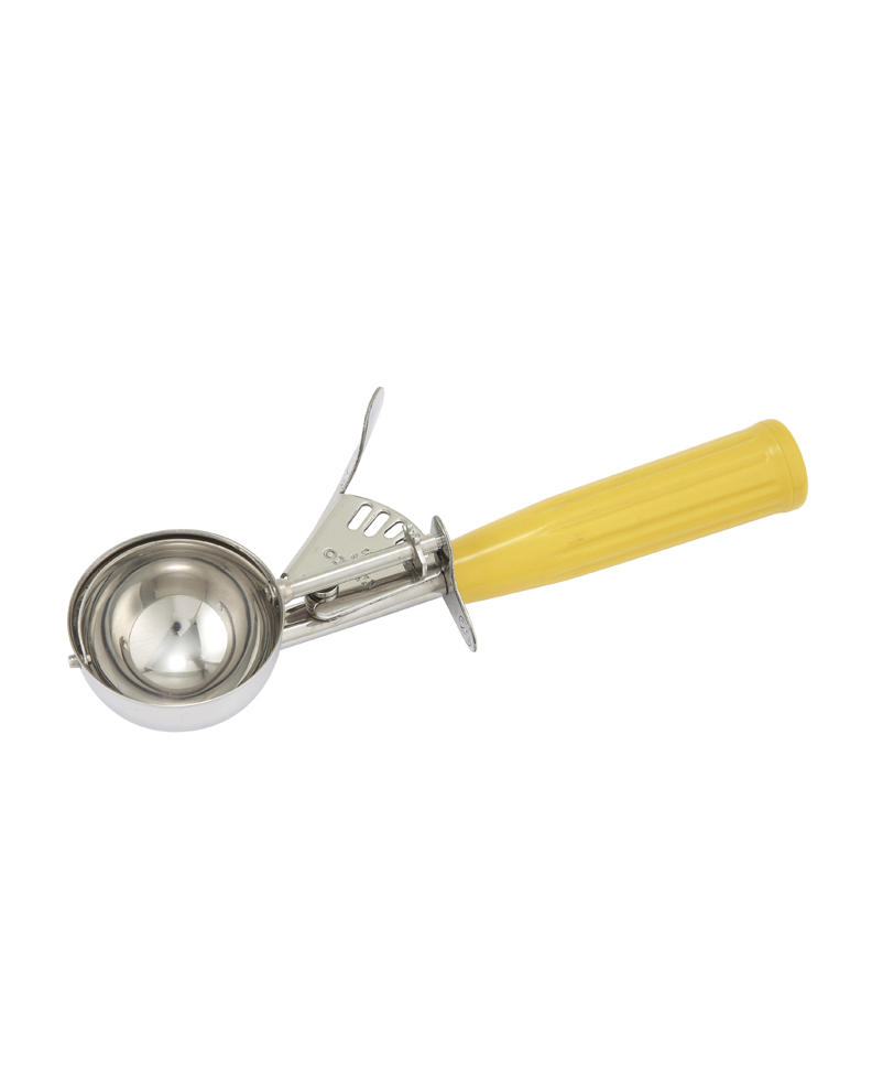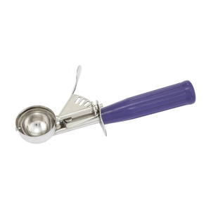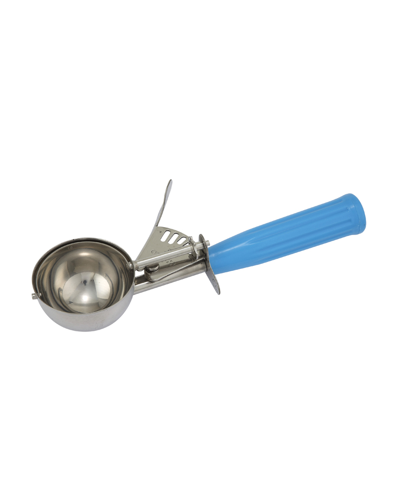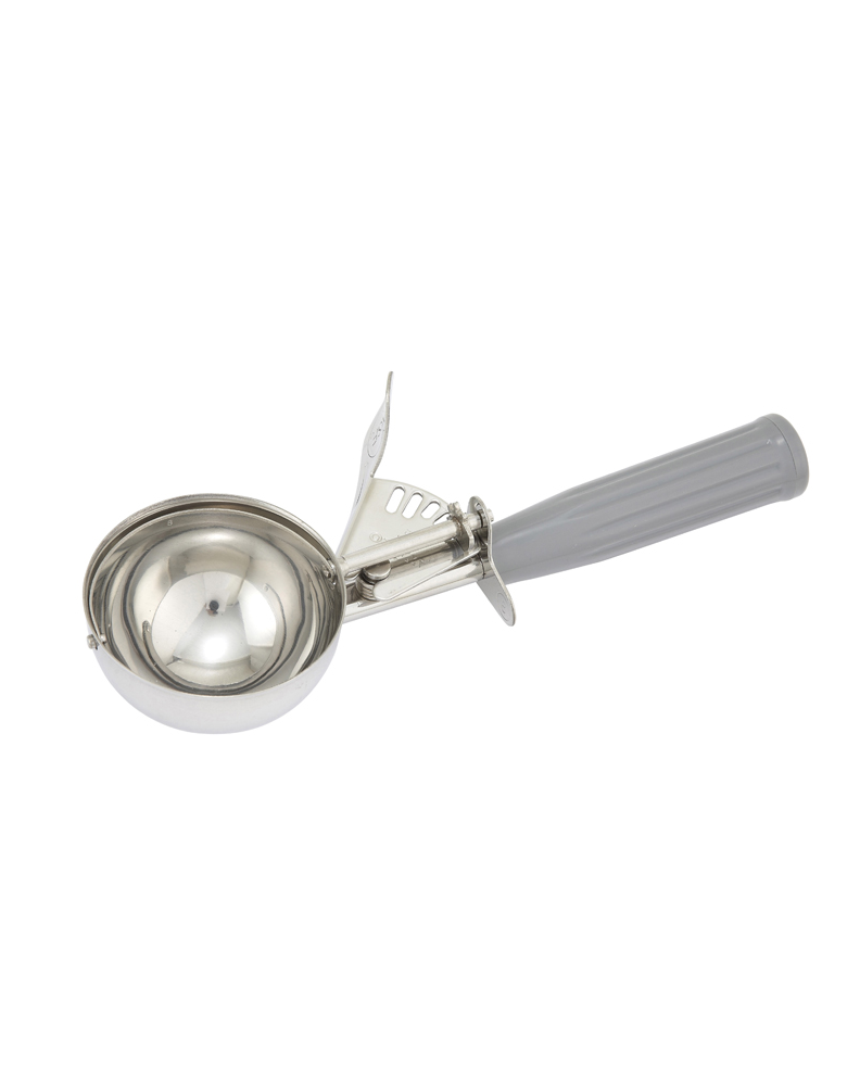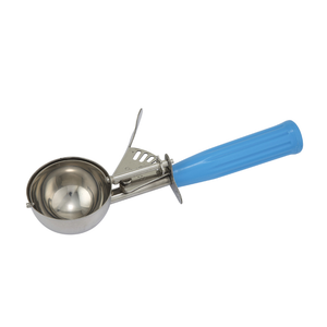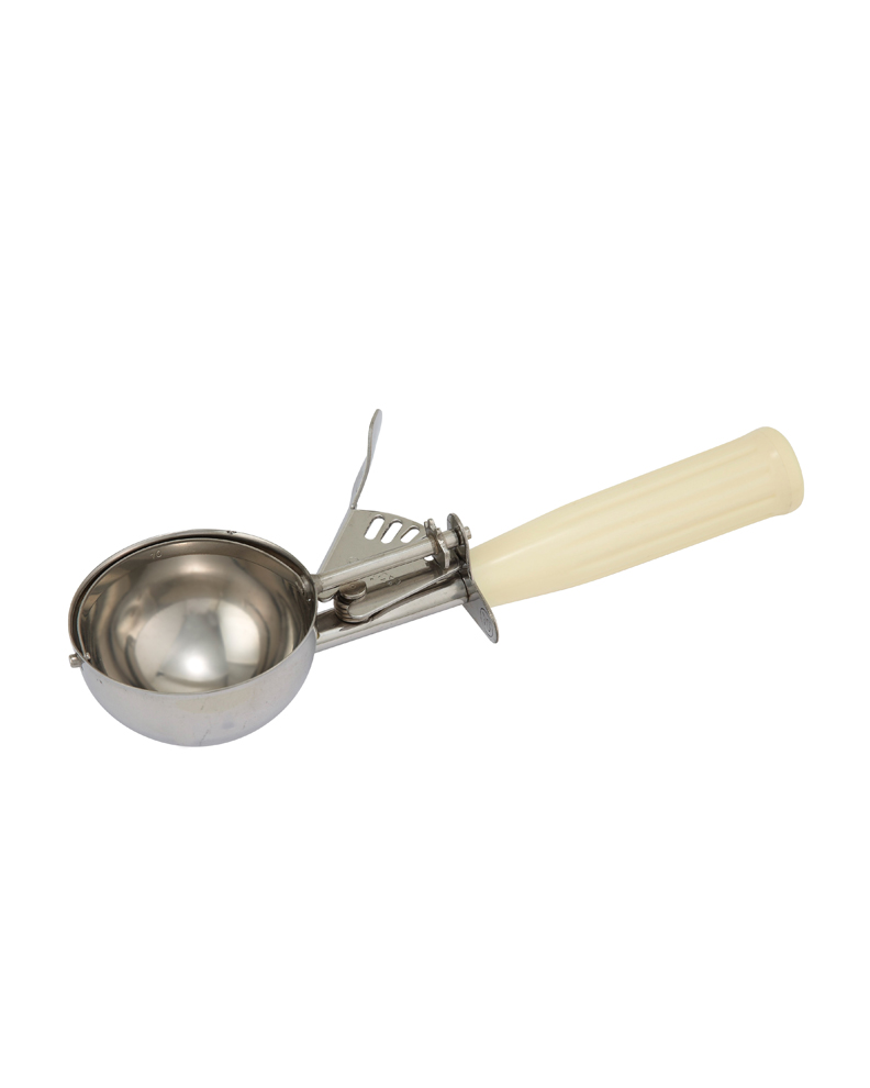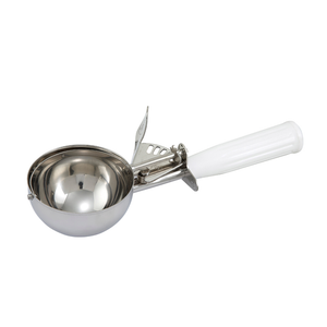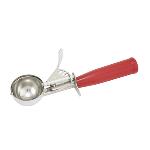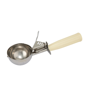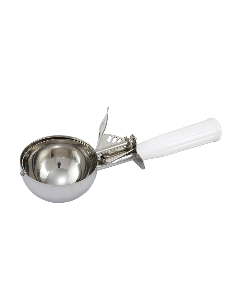 A Winco ice cream disher, also known as a scoop or portion control scoop, is a kitchen utensil used for scooping ice cream or other soft foods into uniform portions. The disher typically has a spring-loaded lever that releases the contents of the scoop when pressed.