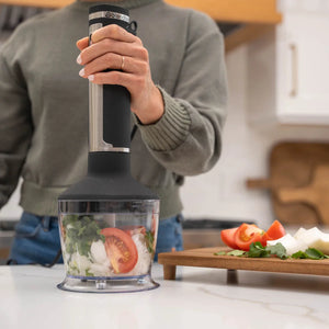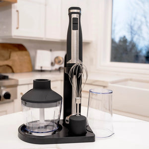 This premium hand blender features a 350 watt, adjustable speed motor making work in the kitchen a breeze. Sold in a bundle, this pack features 3 interchangeable parts allowing you to blend, whisk, and chop. The bundle also comes with a jar for blending and a tray for easy storage. All component parts fit neatly on the storage tray to optimize space.