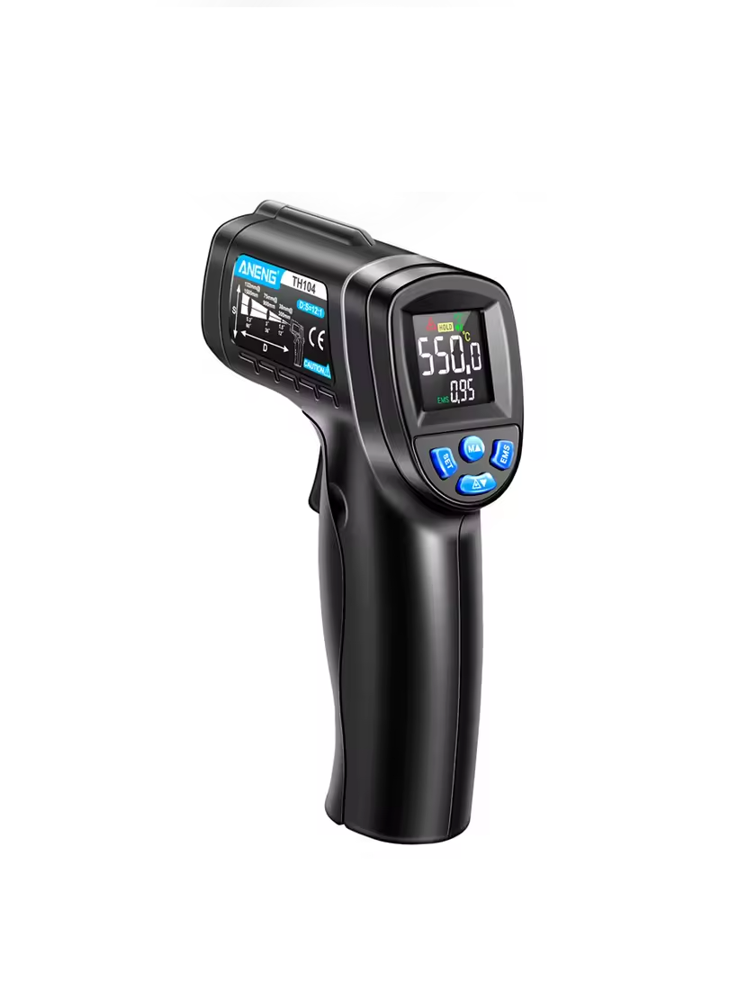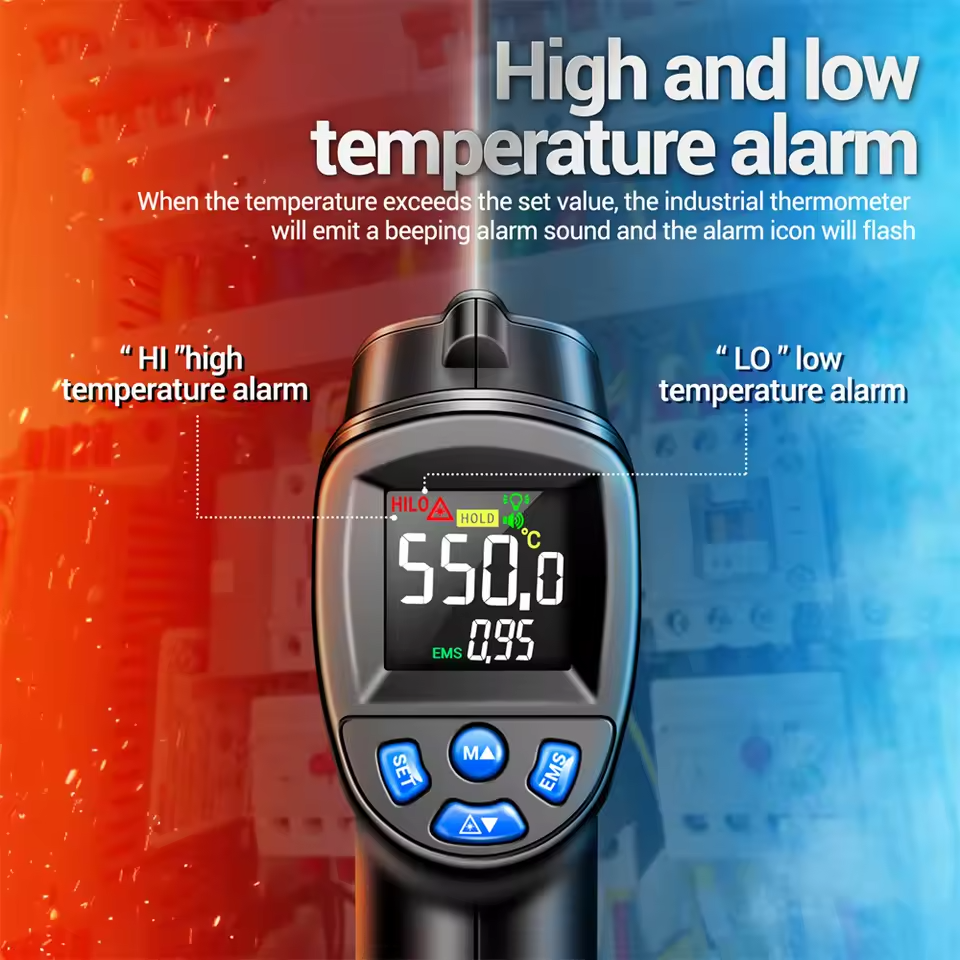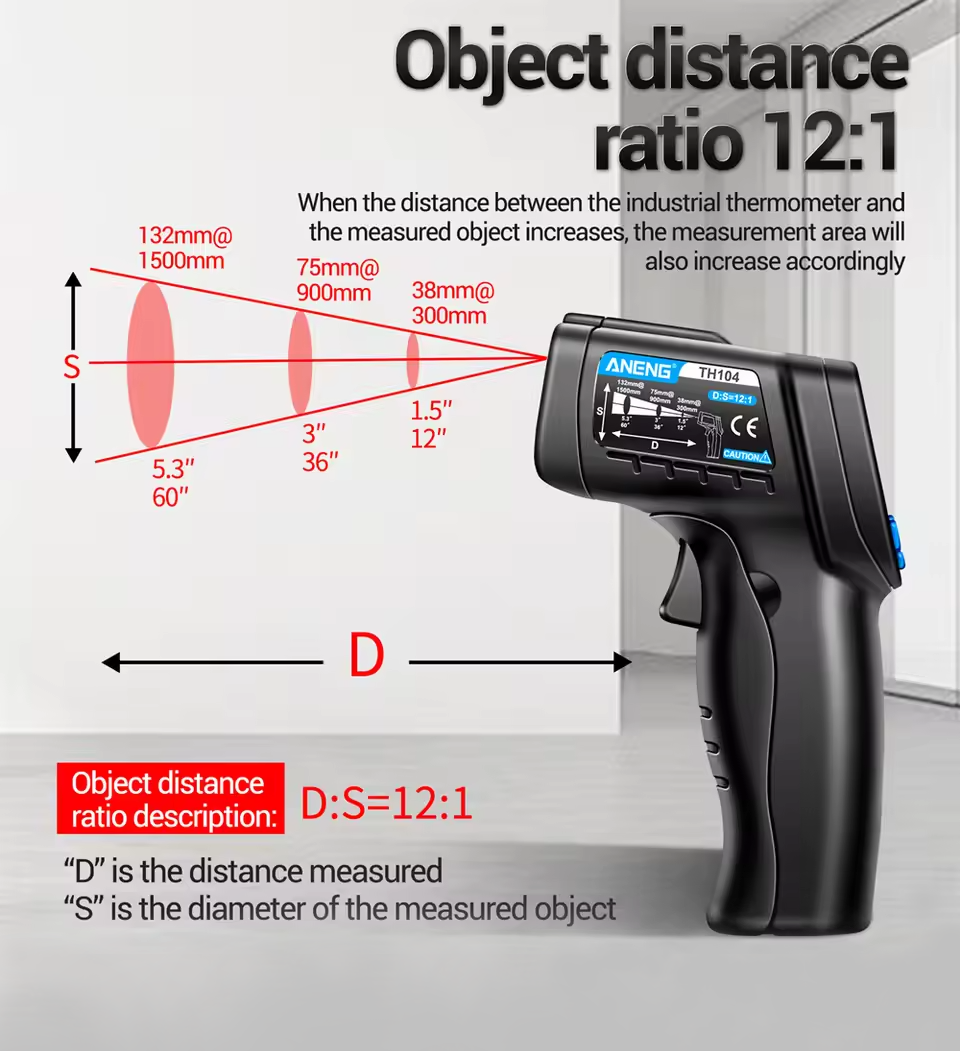 The KNICER Infrared Thermometer is a highly accurate, non-contact temperature measurement tool designed for a wide range of applications. It features a laser pointer for easy targeting and an illuminated display for clear visibility in low-light conditions. With a distance-to-spot ratio of 12:1, it allows precise temperature readings from a safe distance. The thermometer has an adjustable emissivity (0.10 to 1.00) to ensure accurate measurements across various surfaces and materials. It operates within a temperature range of -50°C to 400°C (-58°F to 752°F) and provides readings within 0.5 seconds, making it ideal for both industrial and household use.