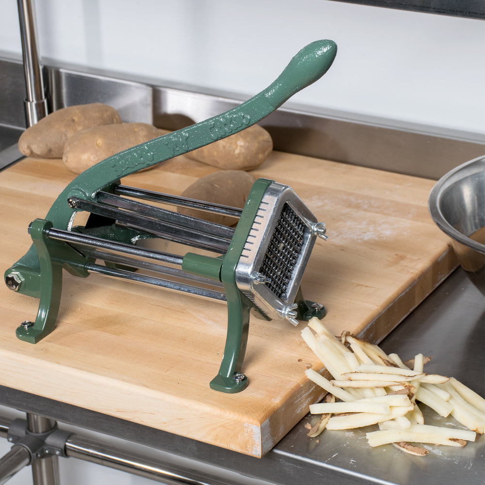 - A cast iron 1/4" French Fry Cutter is a kitchen tool used for cutting potatoes or other vegetables into evenly sized French fries. The cutter typically has a base with suction cups or clamps to secure it to a counter or tabletop, and a lever-operated blade assembly that pushes the vegetable through a grid of sharp blades to create the fries. The cast iron construction is durable and can withstand heavy use, while the 1/4" size is a common thickness for restaurant-style fries.
