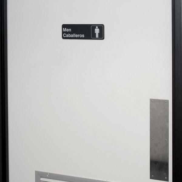 Direct your customers to your men’s restroom or changing room with this Men’s / Caballeros Restroom Sign – Black and White, 9″ x 3″ / Tablecraft. Made of durable plastic, this sleek sign has great color contrast. The white-on-black lettering allows your customers to see and read this sign from across a room. And, those who may have trouble reading, a male symbol is posted to the side.