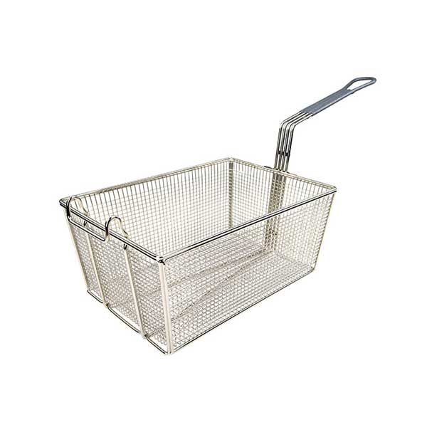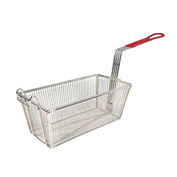 An essential addition to any commercial kitchen, this Nickel Plated Rectangular Fry Basket with Red Handle from Winco is a versatile tool perfect for deep frying, boiling, or blanching. It comes with a front hook to hang basket above the cooking area of the fryer. Also, perfect for making french fries, chips, and mozzarella sticks.