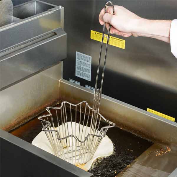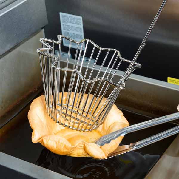 Wow your guests with a large taco bowl using this Nickel Plated 8-1/4″ Round Taco Salad Bowl Fry Basket from Winco. Perfect for molding tortillas into an attractive bowl shape, this kitchen tool is a great addition to any fast-paced foodservice establishment. To use this basket, just float a tortilla on top of your fryer oil, then push the tortilla under the oil with the taco salad fry basket.