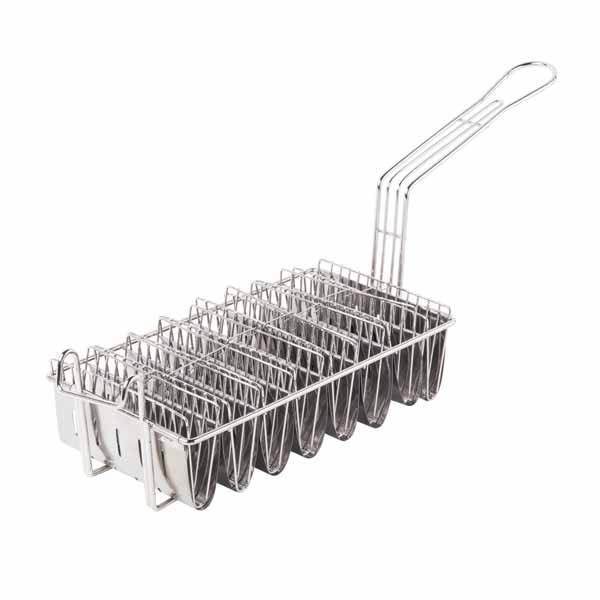 Create ideally formed taco shells with this Nickel Plated 8 Mould Taco Shell Basket from Winco. Excellent for Mexican restaurants and other foodservice facilities, this taco basket is long-lasting and functional and can fry multiple 6-inch shells at once for fast and efficient service. A sturdy nickel-plated steel frame adds durability and the hangers make it simple to remove excess oil and dry off a finished taco too.