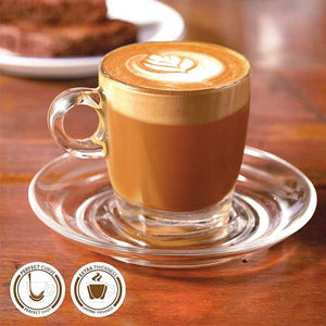 From rich, freshly-brewed coffees to smooth, frothy lattes, this 195ml 6-Piece Set Caffe Glass Cappuccino Cup is sure to capture guests’ attention and boost impulse sales of your specialty hot drinks. This cafe mug is an attractive and versatile accessory to any restaurant, bar, or cafe. It also boasts a durable, crystal-clear glass construction.