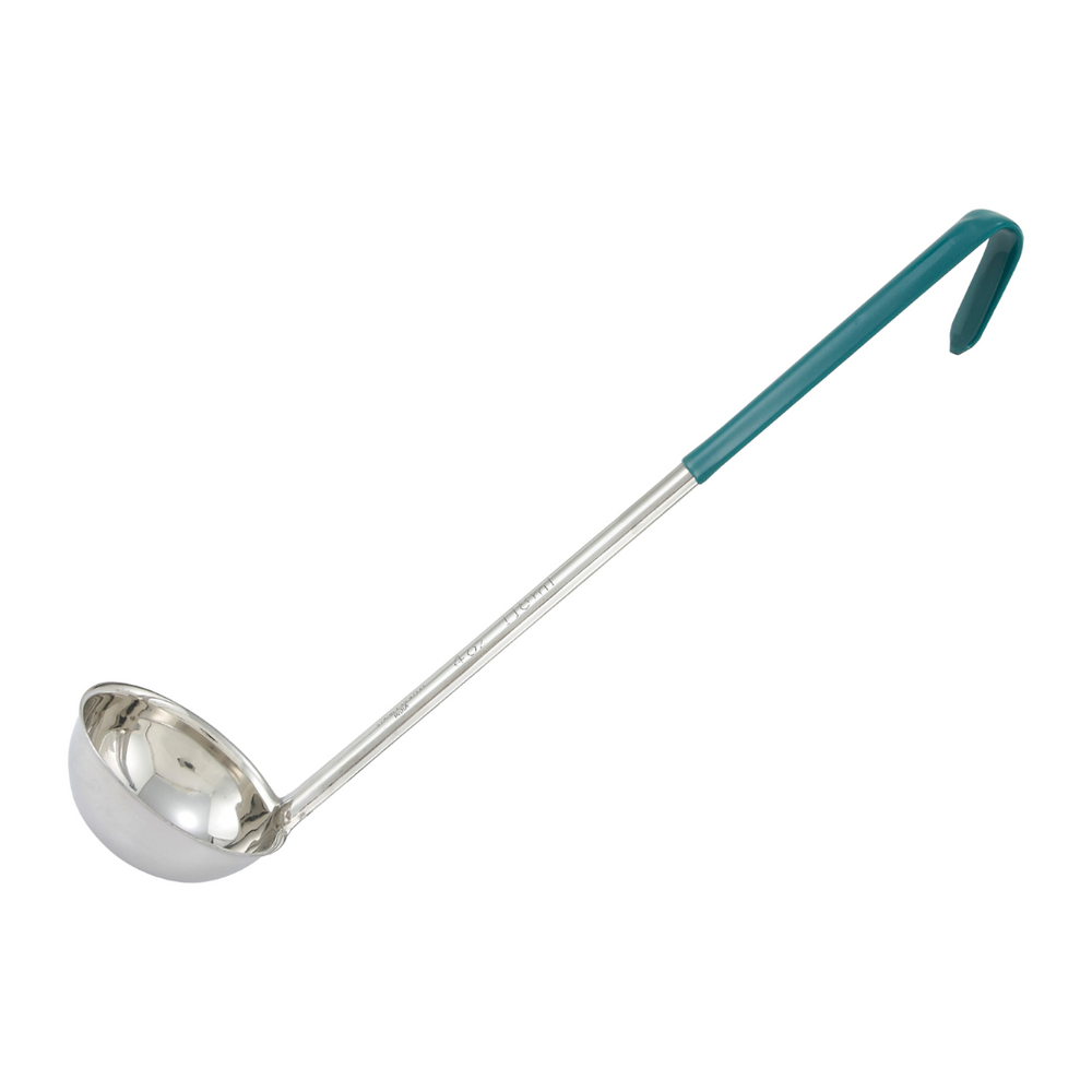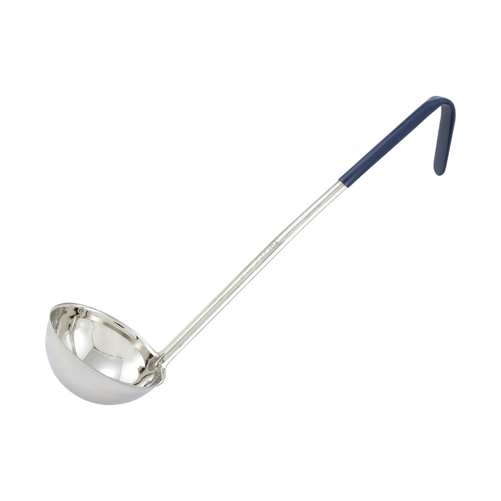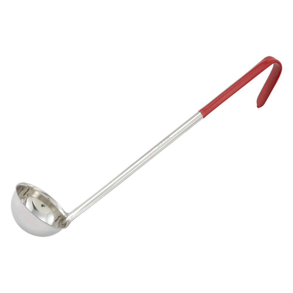 - The One-Piece Stainless Steel Ladle with Color-Coded Handles is a product from Winco that comes in different sizes ranging from 1/2 oz to 12 oz. It is made from durable stainless steel and features a one-piece construction for easy cleaning and maintenance. The color-coded handles make it easy to identify the different sizes, making it perfect for busy kitchens and restaurants. The ladle can be used for serving soups, stews, sauces, gravies, and other liquids. With its sturdy construction and ergonomic design, this ladle is a reliable and essential tool for any kitchen.