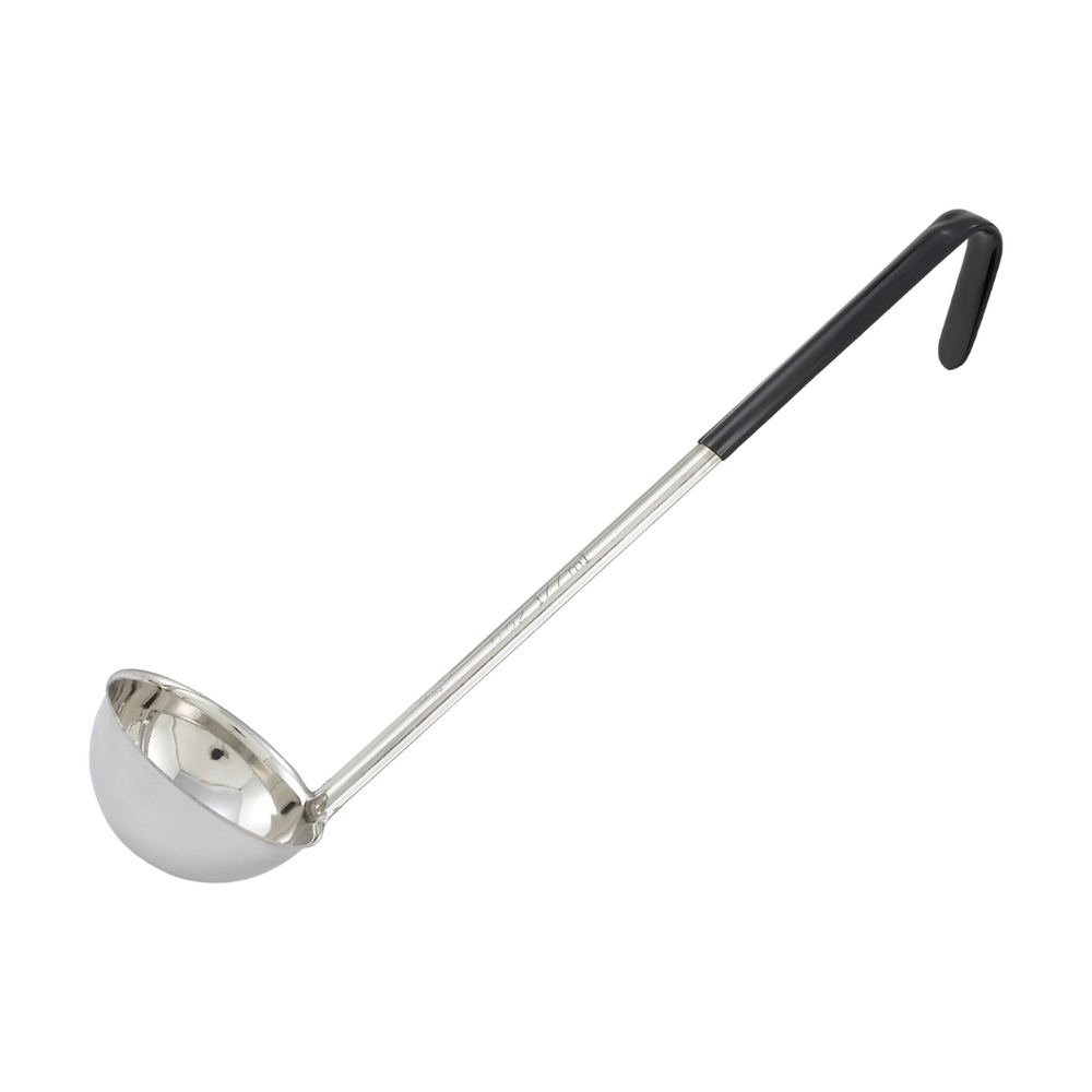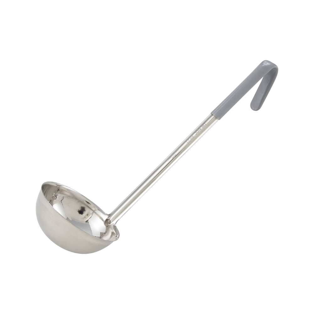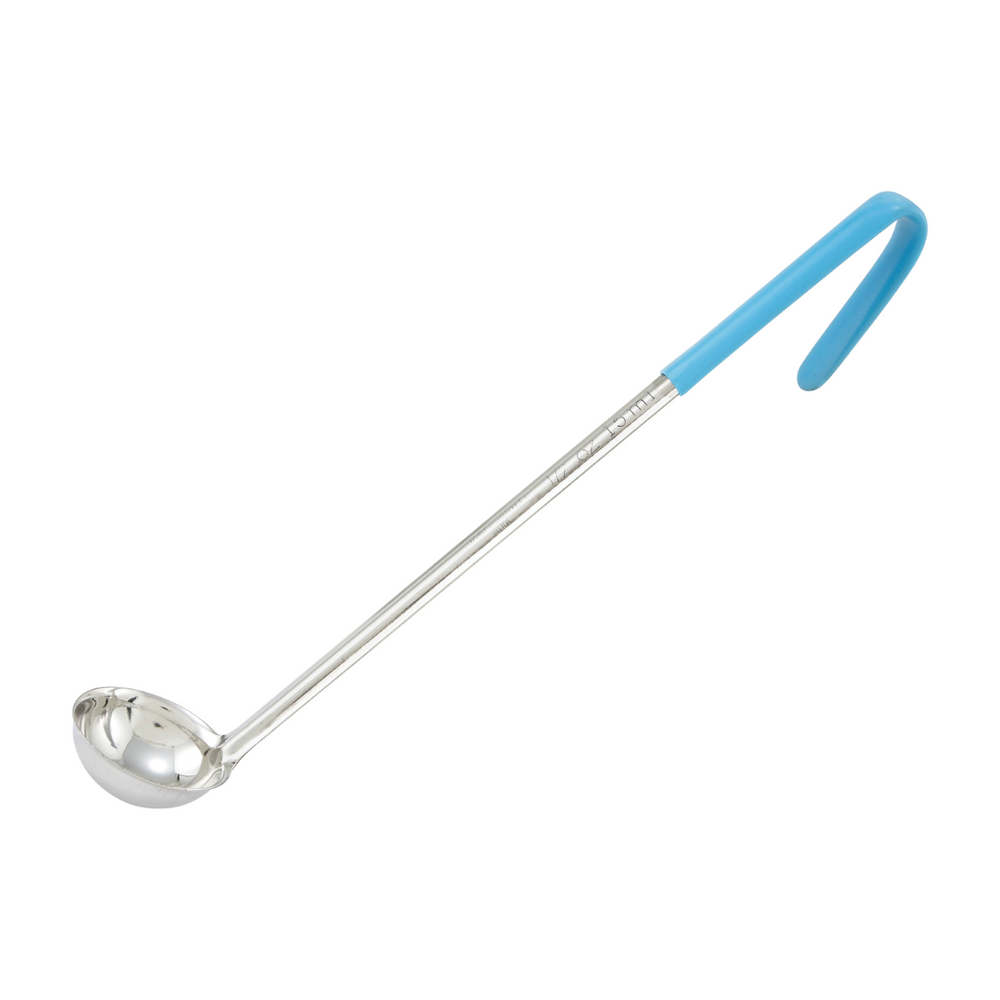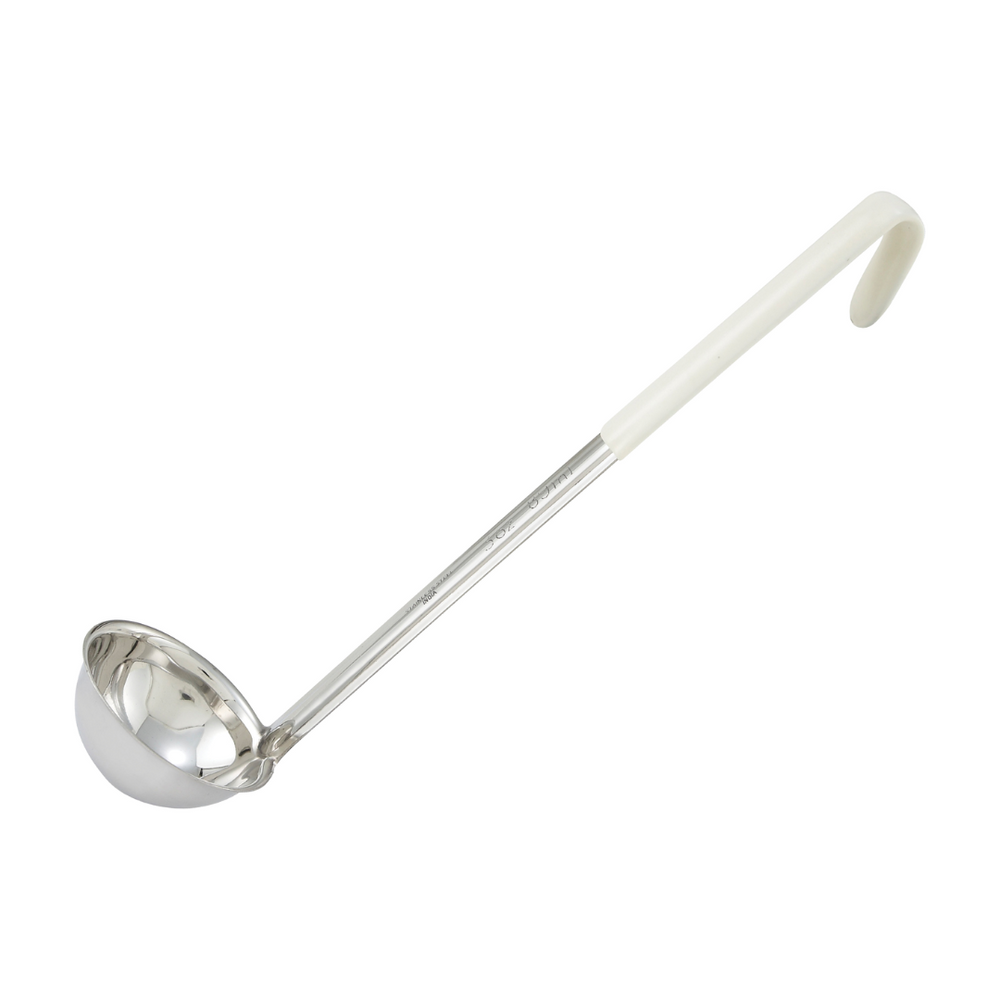 - The One-Piece Stainless Steel Ladle with Color-Coded Handles is a product from Winco that comes in different sizes ranging from 1/2 oz to 12 oz. It is made from durable stainless steel and features a one-piece construction for easy cleaning and maintenance. The color-coded handles make it easy to identify the different sizes, making it perfect for busy kitchens and restaurants. The ladle can be used for serving soups, stews, sauces, gravies, and other liquids. With its sturdy construction and ergonomic design, this ladle is a reliable and essential tool for any kitchen.