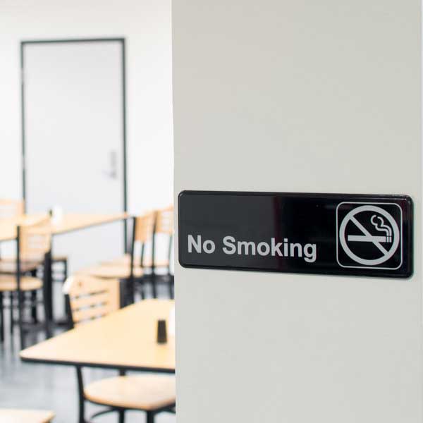 Inform your patrons of the smoking policy within or around your establishment with this 9″ x 3″ No Smoking Sign / Tablecraft. Featuring a black background with bold white lettering, this sign’s message is easy to read. For those who may have trouble reading, a no-smoking symbol is posted to the side. This sign can easily be attached anywhere you see fit with the included self-adhesive support.