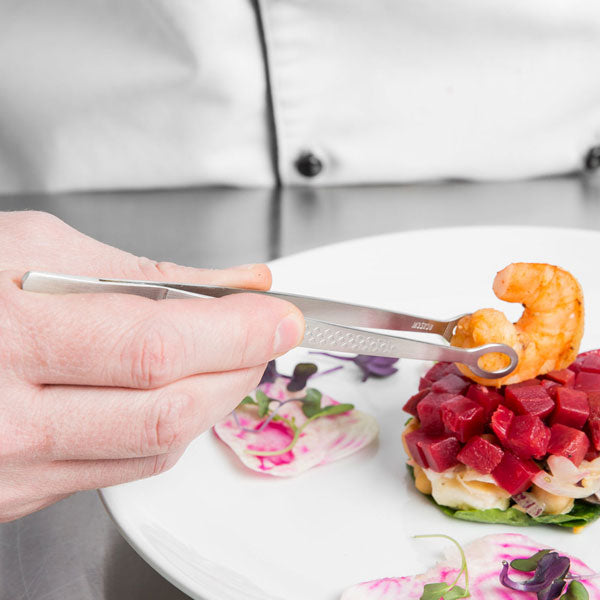 These Precision Plus 6 1/8″ Flat Oval Plating Tongs are used for decorating pastries and main courses without cutting or breaking your smallest or most delicate ingredients. They’re ideal for precise plating applications, so you can add detail to any dish at your hotel, event, bakery, or upscale restaurant.