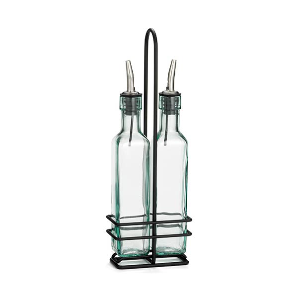 This set is excellent for serving the oil, vinegar, or even salad dressings. The clear green-tinted glass construction ensures excellent visibility. This provides easy product identification for your patrons and helps your staff see when the bottles need a refill. The unique embracing design saves space and provides a different visual appearance. The size of each bottle is ideal for table or bar top use, and the durable black powder-coated rack keeps everything organized for a clean, seamless presentation. The rack also has a looped top that makes it easy to grab this set easily and quickly throughout the busy dinner service.
